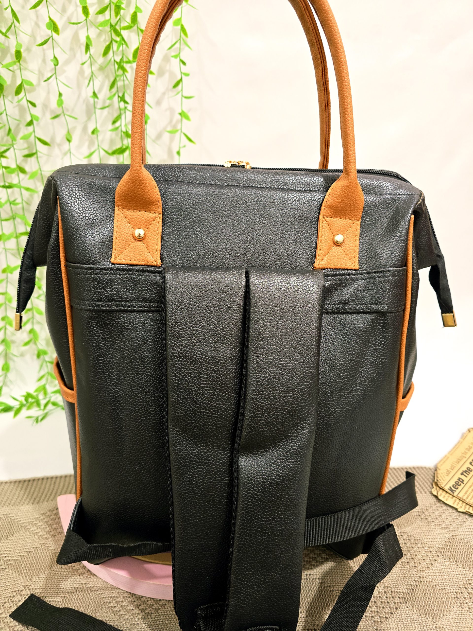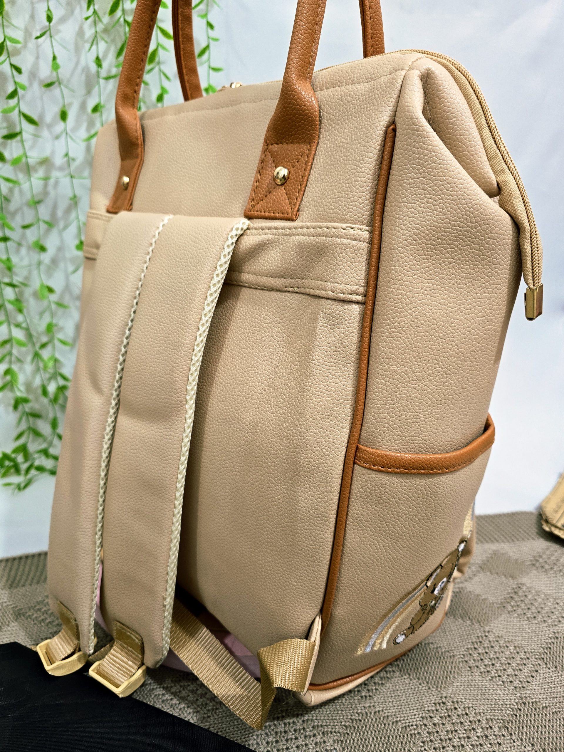 رنگ عسلی گرم این ساک به‌راحتی با انواع استایل‌های روزمره ست می‌شود و ظاهر شیکی به والدین می‌بخشد.